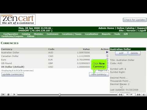 Let us learn how to configure your currency in ZenCart. Select Currencies from the Localization list on the top of the screen of the ZenCart. Once you have selected Currencies, a display will open up of your Currencies page, select the Edit button to the right of the screen. Scroll down the page to the Value section to the right hand side of the screen and type a new Value. Then select Update. This will bring you to a new screen verifying the value of the currency has been updated.