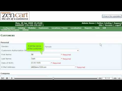 Let us learn how to manage your customers in ZenCart. Select Customers from the Customers list at the top of the screen of the ZenCart. Once you have selected Customers, a display will open up of your Customers page, this is the list of customers, select the customer you wish to update and then select edit to the right of the screen. A new display will appear of the customer's information; you may edit any part of this page, such as edit the name, address and so on. Once you have completed your update, scroll down to the end of the page to select Update. This will bring you to the Customers page verifying the customer's information has been updated.