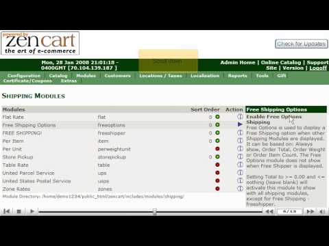 Let us learn how to add shipping modules in ZenCart. Select Shipping from the Modules list on the top of the screen of the ZenCart. A new screen will appear of the list of Shipping Modules, under the Sort Order, you can view which shipping modules that have been added. The green circle represents the shipping modules that have been added and the red circles are those waiting to be added. Once you have selected the shipping module you wish to add, select the Install button on the right hand side of the screen and scroll down to enter the Shipping Cost, how much the customer has to spend for free shipping and so on. After you have completed filling in the shipping information, select the Update button.